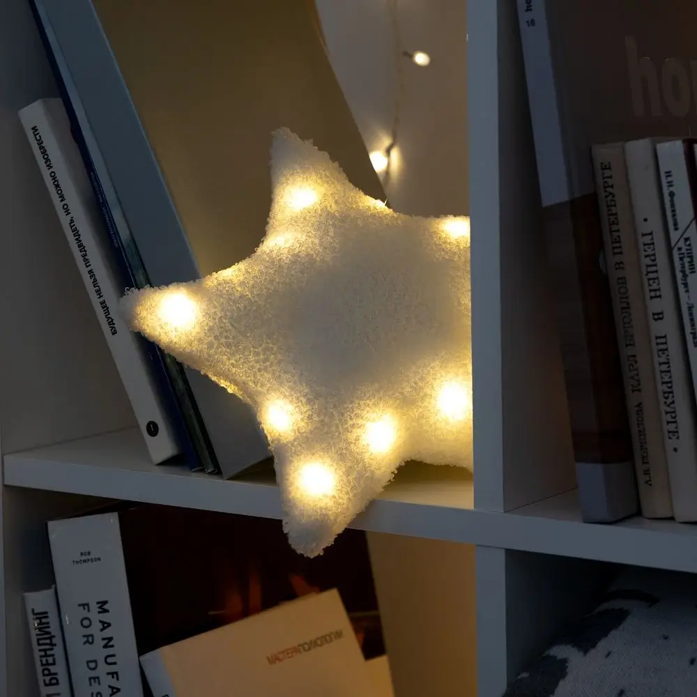 Внутри мягкой звездочки находится миниатюрная гирлянда с теплым светом. Работает от 2 батареек типа CR2032 (входят в комплект).