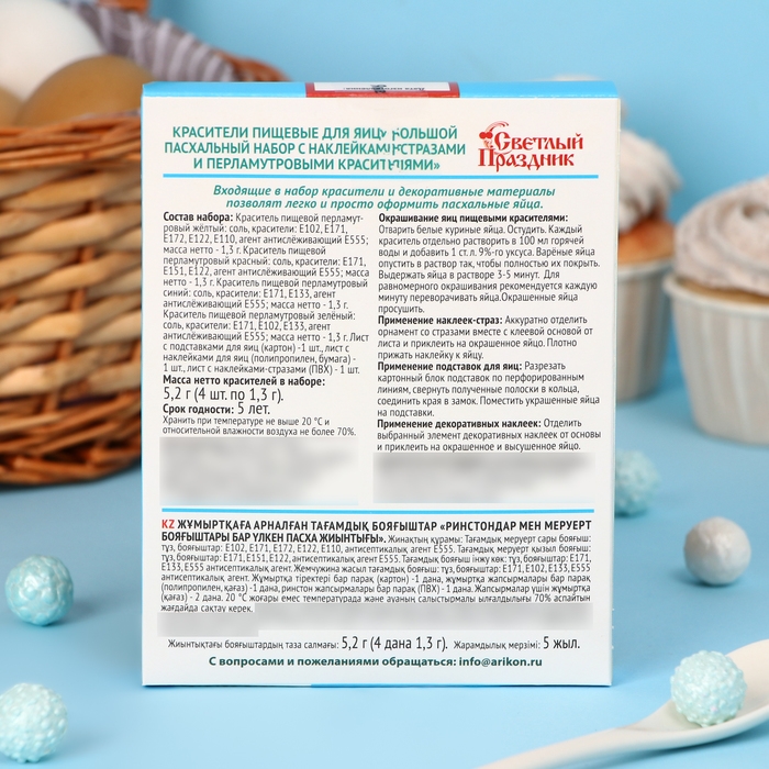 С помощью этого набора вы сможете окрасить пасхальные яйца в четыре разных цвета: красный, жёлтый, зелёный и синий с перламутровым блеском. Кроме красителей в состав набора также входят классические наклейки и стразы, для оригинального украшения пасхальных яиц, которые можно использовать для привлечения детей к процессу окрашиванию.