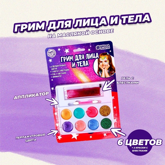 В комплекте: 6 перламутровых оттенка грима, гель с блёстками, аппликатор для нанесения средства.