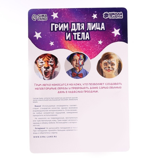 Грим для лица — это декоративная косметика, которая позволит ребёнку мгновенно перевоплотиться в персонажа на свой вкус. А взрослые с его помощью смогут создать неповторимый образ для любого праздничного случая: дня рождения, Хеллоуина, Дня России или тематической вечеринки.