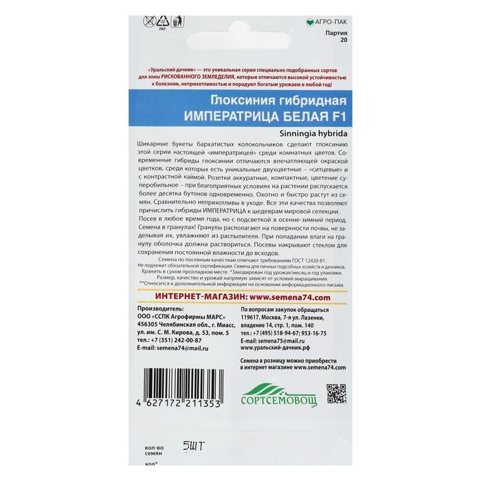 Семена комнатных цветов Глоксиния "Императрица Белая", F1, 5 шт.