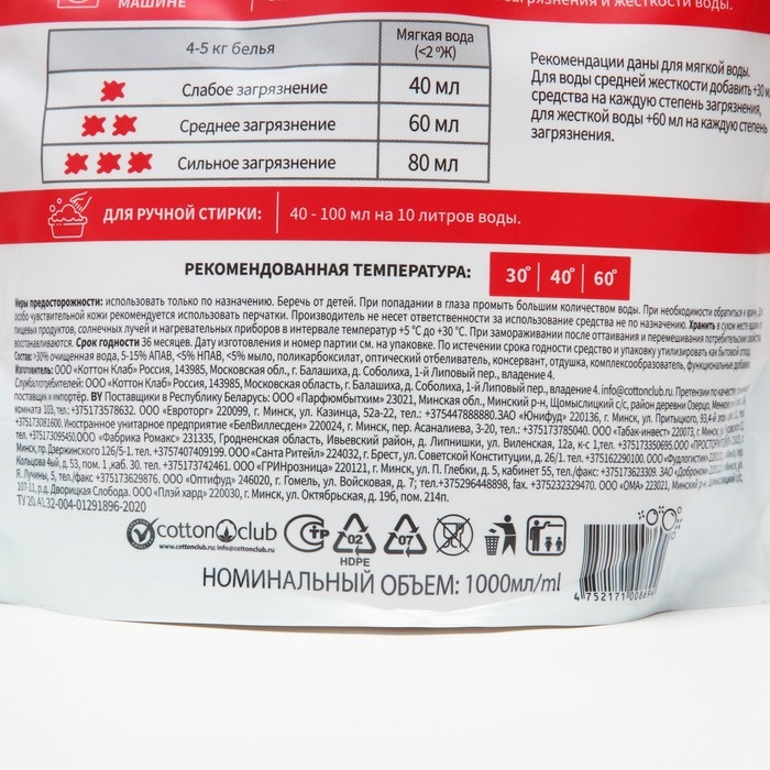 Состав: АПАВ, НПАВ, мыло, оптический отбеливатель, растительный экстракт, отдушка, консервант. Содержит экстракт хлопка и ингибитор переноса красителя.