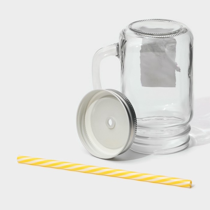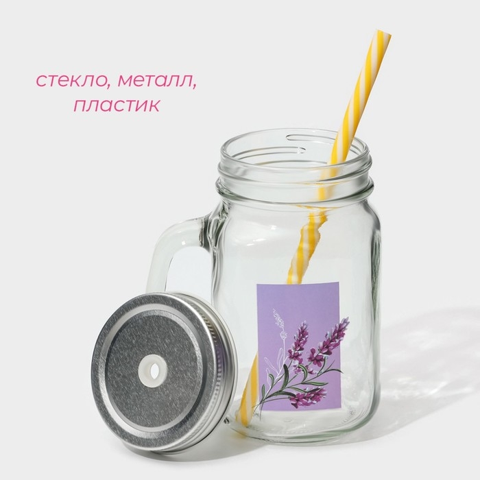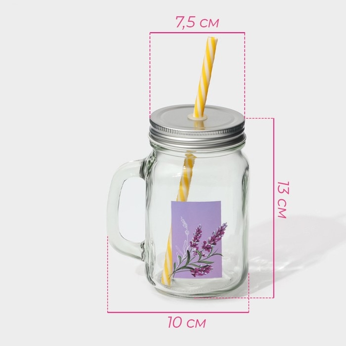 Кружка стеклянная Доляна «Лаванда», 450 мл, 10×7,5×13 см, с ручкой, крышкой и трубочкой