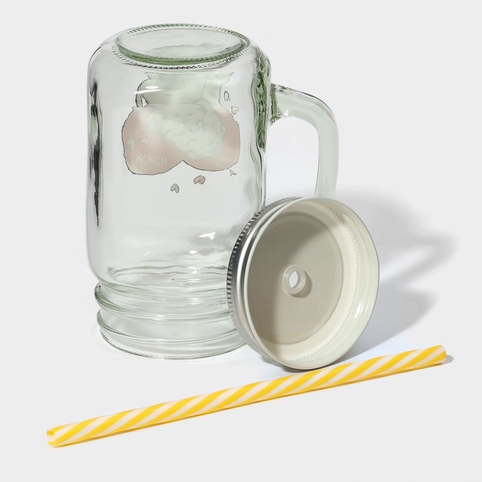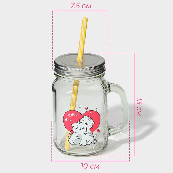 Кружка стеклянная Доляна «Котик», 450 мл, 10×7,5×13 см, с ручкой, крышкой и трубочкой
