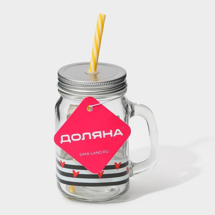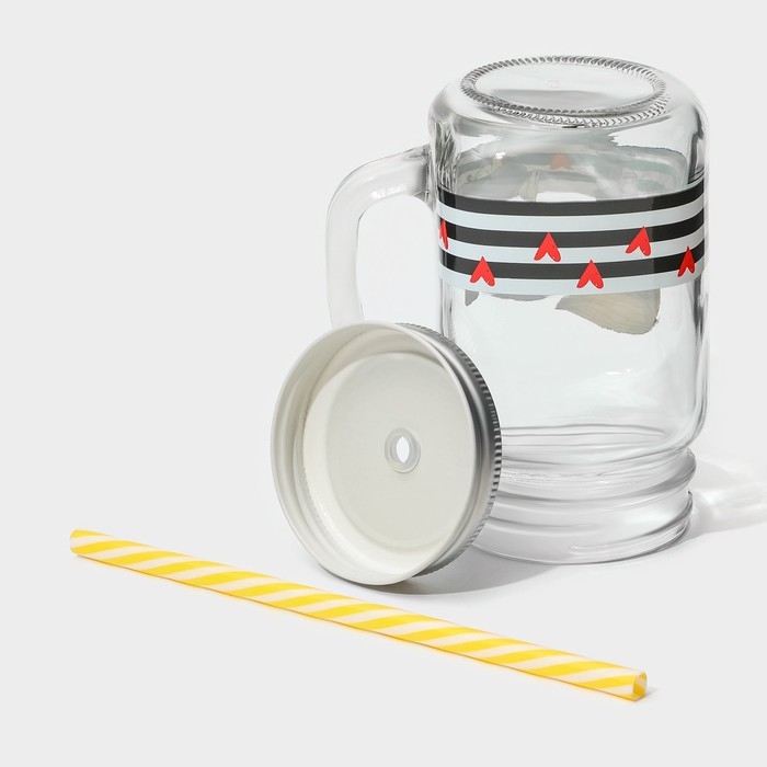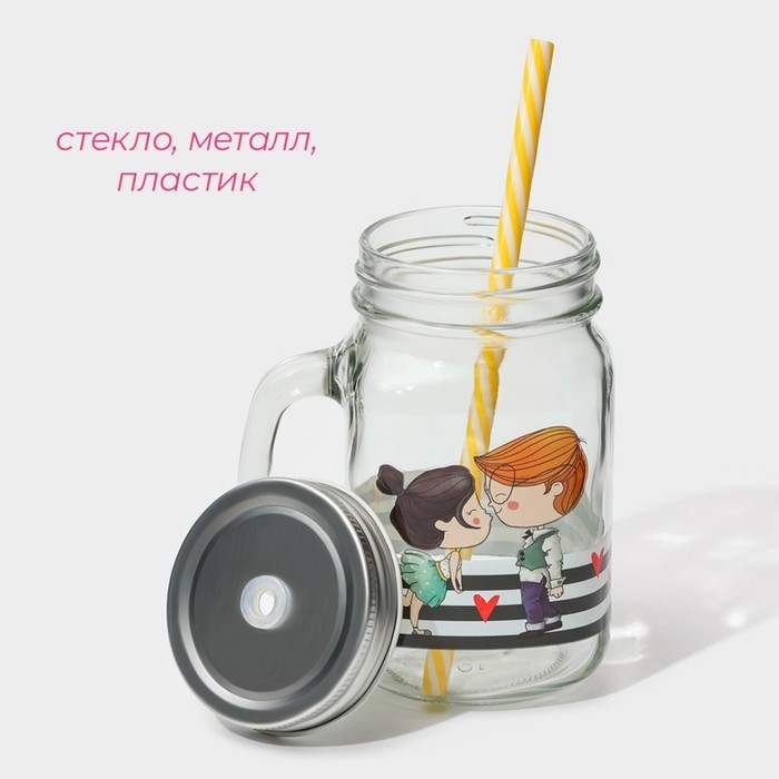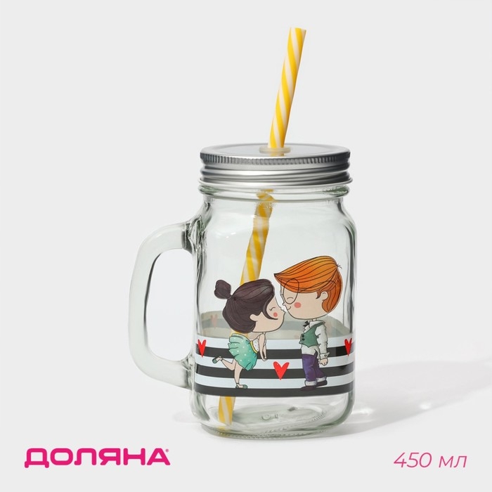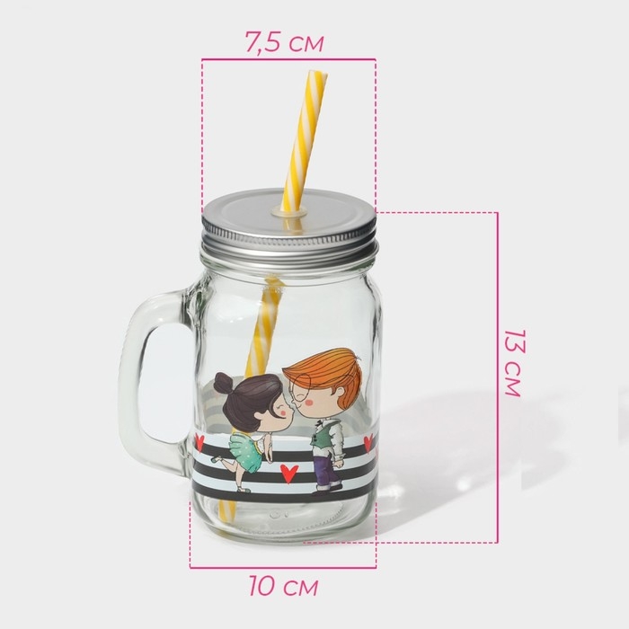 Кружка стеклянная с крышкой и трубочкой Доляна «Поцелуй», 450 мл, 10×7,5×13 см