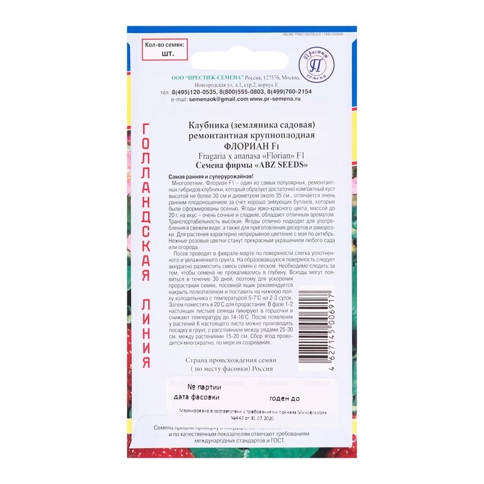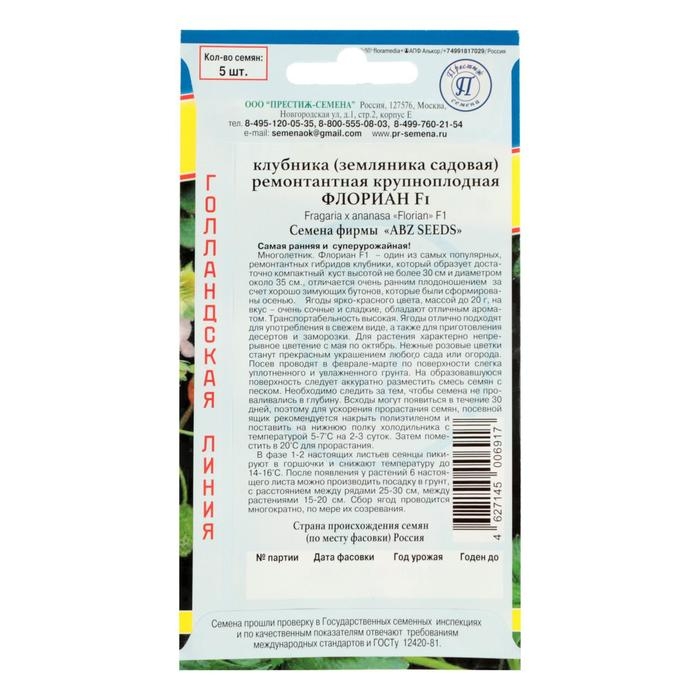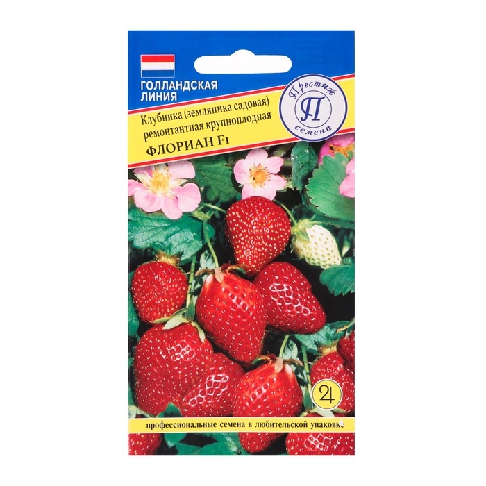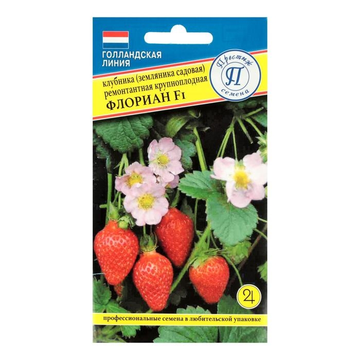 Многолетник. Флориан F1 – один из самых популярных, ремонтантных гибридов клубники, который образует достаточно компактный куст высотой не более 30 см и диаметром около 35 см., отличается очень ранним плодоношением за счет хорошо зимующих бутонов, которые были сформированы осенью. Ягоды ярко-красного цвета, массой до 20 г, на вкус – очень сочные и сладкие, обладают отличным ароматом. Транспортабельность высокая. Ягоды отлично подходят для употребления в свежем виде, а также для приготовления десертов и заморозки. Для растения характерно непрерывное цветение с мая по октябрь. Нежные розовые цветки станут прекрасным украшением любого сада или огорода. Посев проводят в феврале-марте по поверхности слегка уплотненного и увлажненного грунта. На образовавшуюся поверхность следует аккуратно разместить смесь семян с песком. Необходимо следить за тем, чтобы семена не проваливались в глубину. Всходы могут появиться в течение 30 дней, поэтому для ускорения прорастания семян, посевной ящик рекомендуется накрыть полиэтиленом и поставить на нижнюю полку холодильника с температурой 5-7°С на 2-3 суток. Затем поместить в 20°С для прорастания. В фазе 1-2 настоящих листьев сеянцы пикируют в горшочки и снижают температуру до 14-16°С. После появления у растений 6 настоящего листа можно производить посадку в грунт, с расстоянием между рядами 25-30 см, между растениями 15-20 см. Сбор ягод проводится многократно, по мере их созревания.