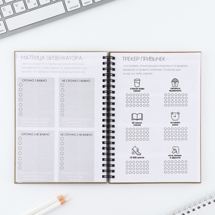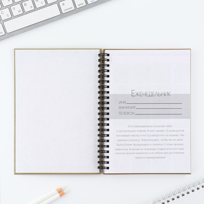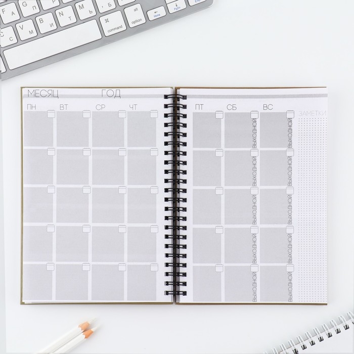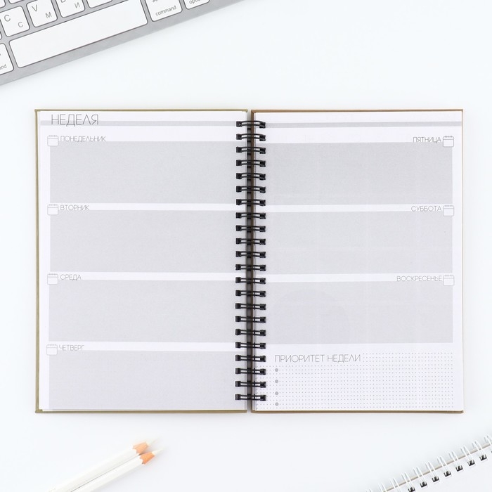Этот еженедельник поможет тебе в организации планов. Он состоит из 12 разворотов на каждый месяц и 5 разворотов на неделю.