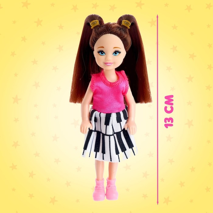 Вика одета в очаровательное праздничное платье, которое делает её образ ещё более нежным и волшебным. Кукла небольшого размера — всего 13 см.