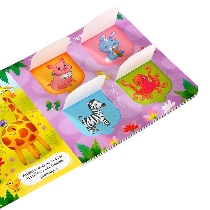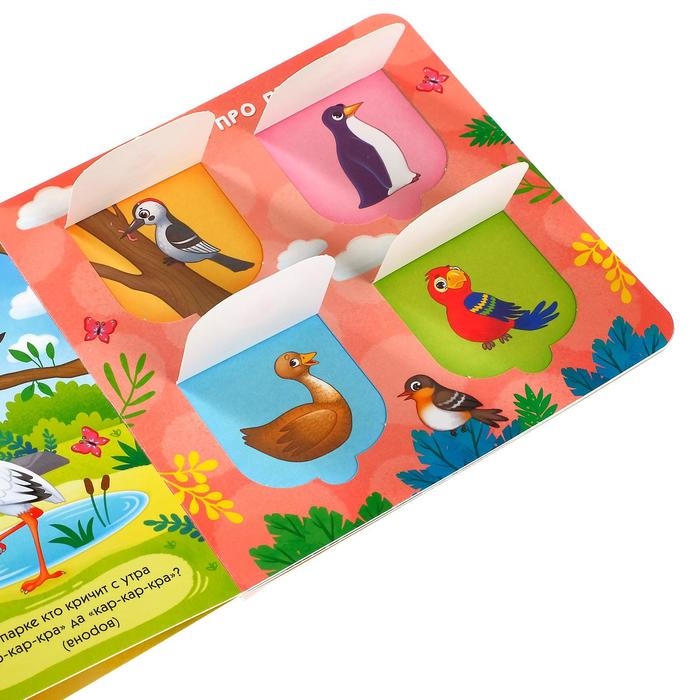 Книга сделана из плотного картона, поэтому прослужит долго. Внутри ребёнок найдёт 16 окошек с загадками про животных и птиц.