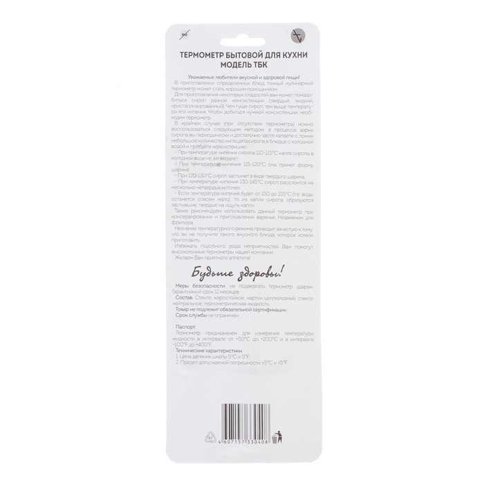 Термометр пищевой кулинарный - это незаменимый помощник на кухне. Идеален для измерения температуры в кастрюле и прочих ёмкостях. Имеется удобное и надёжное крепление на край посуды. Изготовлен из прочного жаростойкого стекла, без использования ртути, абсолютно безопасен.