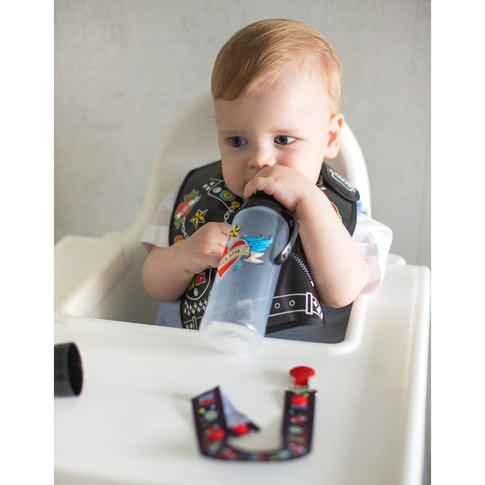 Нагрудник не промокает и качественно защищает, поэтому одежда малыша не испачкается в процессе кормления. У слюнявчика есть специальный кормашек, который выворачивается на лицевую сторону на время приема пищи, в него попадают все крошки: чистым останется не только сам ребёнок, но и место, где он кушает.