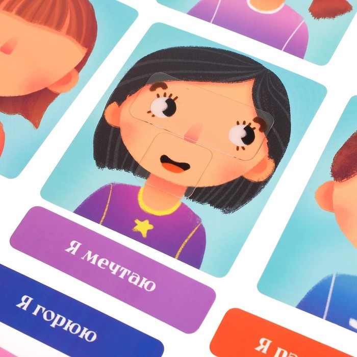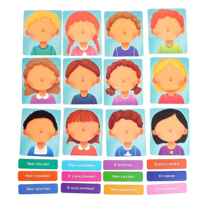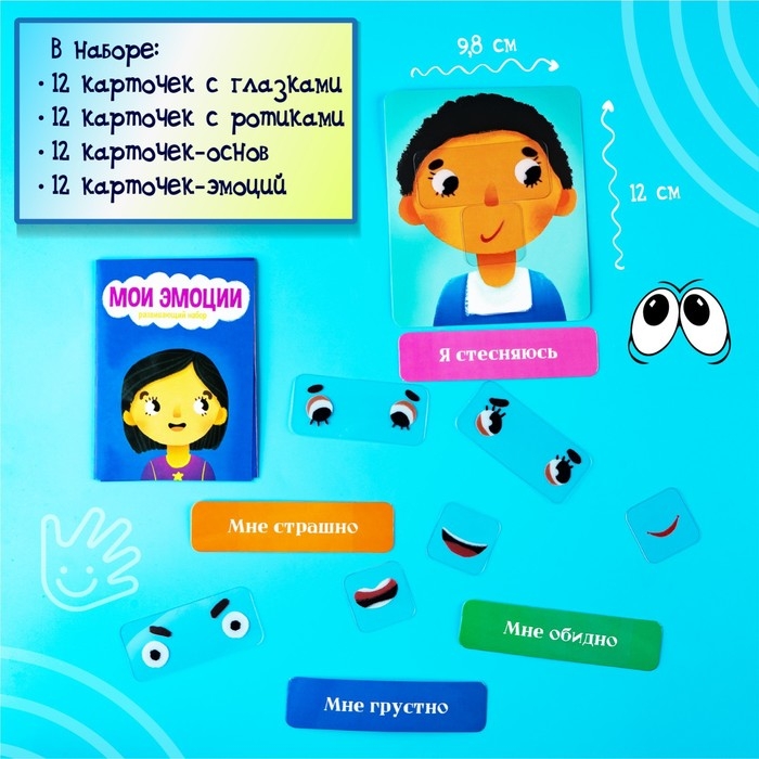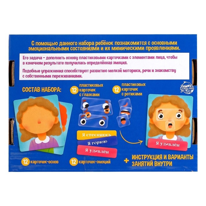 В наборе: 12 пластиковых карточек с глазками, 12 пластиковых карточек с ротиками, 12 карточек-основ, 12 карточек-эмоций. Ознакомьте ребёнка с правилами игры в инструкции.