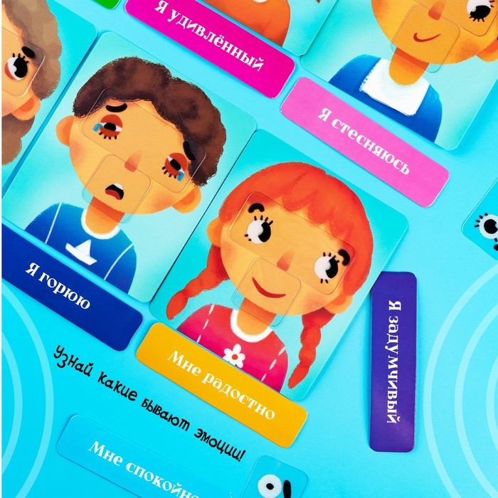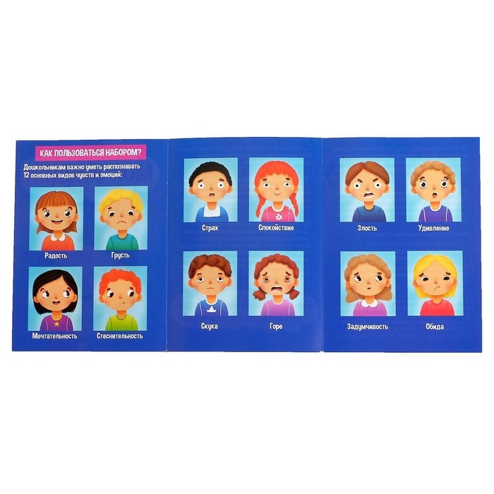 С набором ребёнок узнает, какие бывают эмоции, как показывать радость или грусть, что такое удивление или смущение. Попросите малыша изобразить эмоции на своём лице.