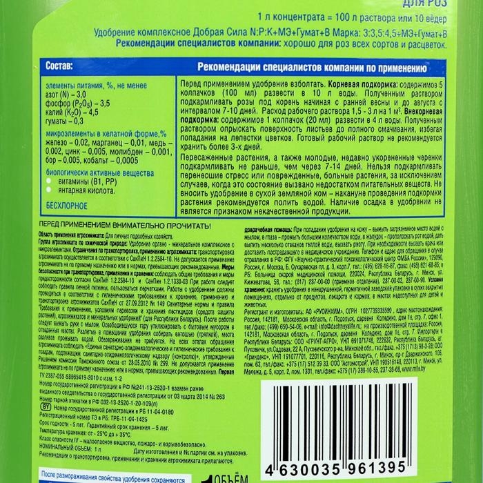 Жидкое органо-минеральное удобрение Добрая сила для роз, 1 л