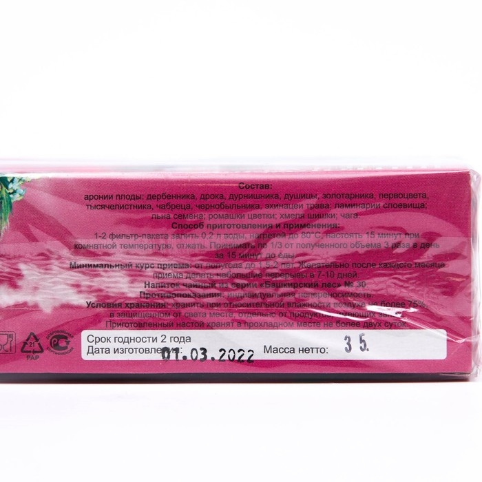 Состав: аронии, рябины плоды; березы листья; дербенника, донника, дурнишника, душицы, зверобоя, золотарника, зопника, зюзника, крапивы, люцерны, медуницы, первоцвета, подмаренника, полыни Божье дерево, пустырника, синеголовника, таволги, тысячелистника, цикория, чабреца, чернобыльника, эхинацеи трава; гречихи цветущие верхушки; ели, сосны хвоя; ивы кора; ламинарии слоевища; льна семена; чага.