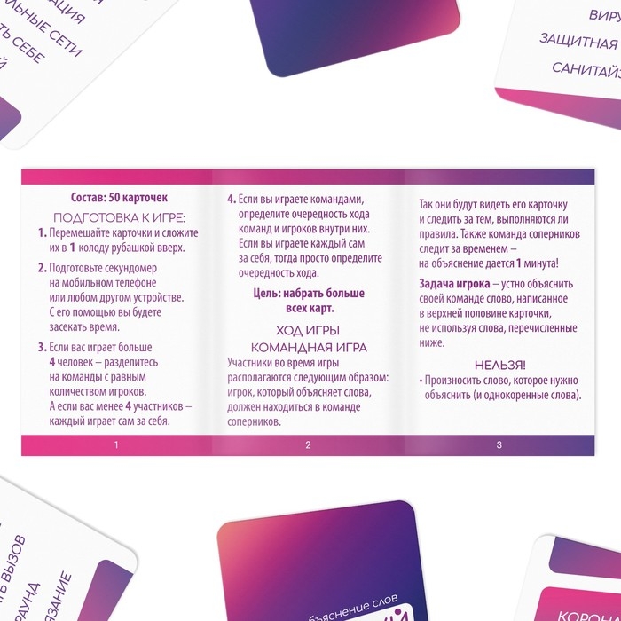 Конечно! Вытягивайте карточки по очереди и объясняйте слова остальным игрокам. У вас есть минута, чтобы объяснить как можно больше. Но играйте по правилам — использовать слова, перечисленные на карточке, нельзя. А победит тот, кто наберёт больше всех карт!