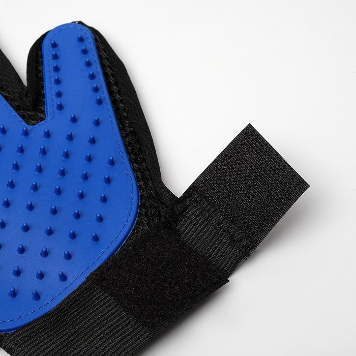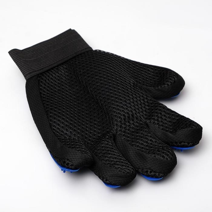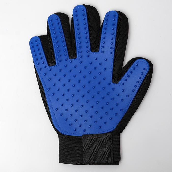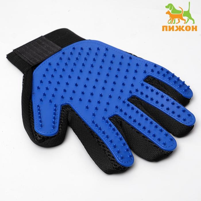 Перчатка - щетка для шерсти на правую руку с удлиненными зубчиками, синяя
