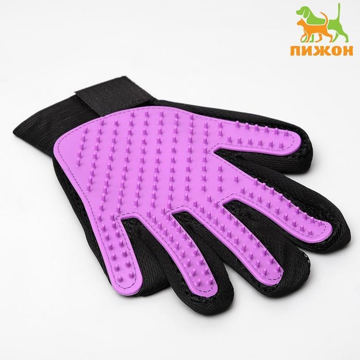 Перчатка-щетка для шерсти на левую руку из неопрена с удлиненными зубчиками, фиолетовая