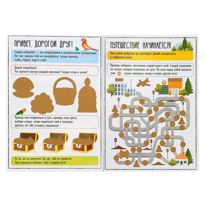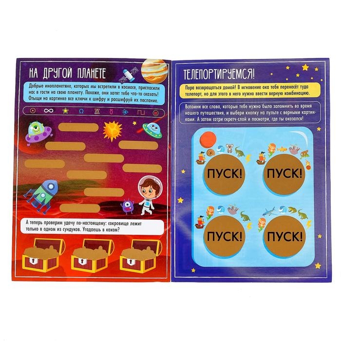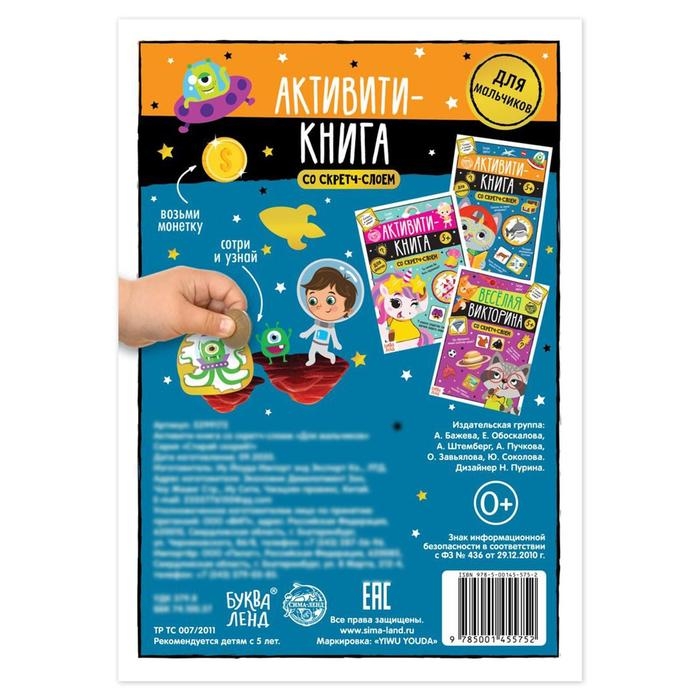 Активити-книга для мальчиков содержит увлекательные задания и волшебные картинки, спрятанные под скретч-слоем. Сотрите его монеткой и узнайте, что внутри!