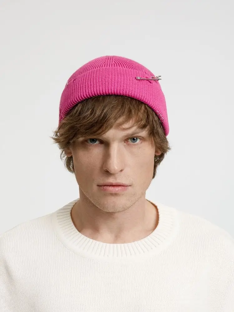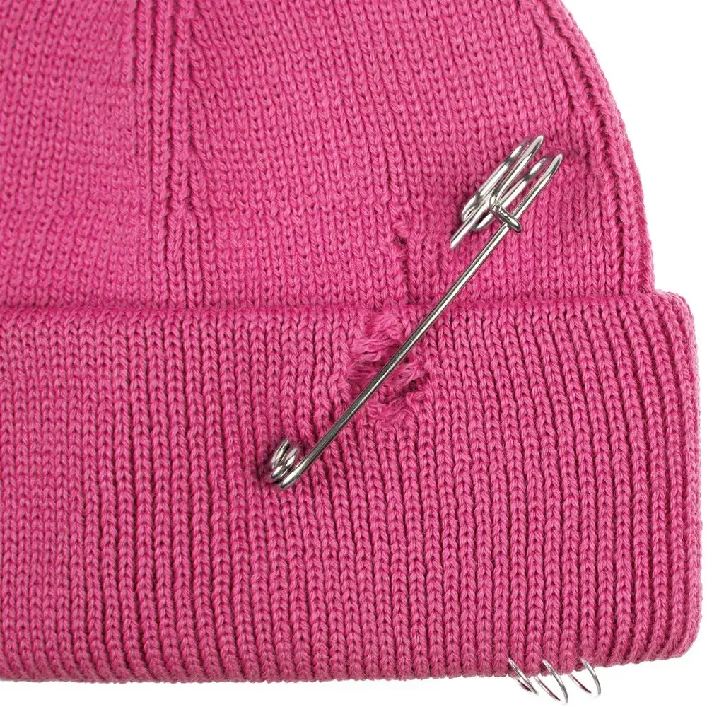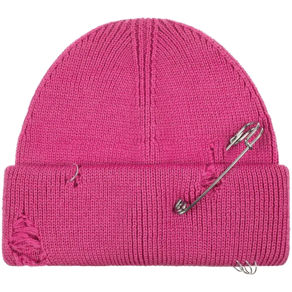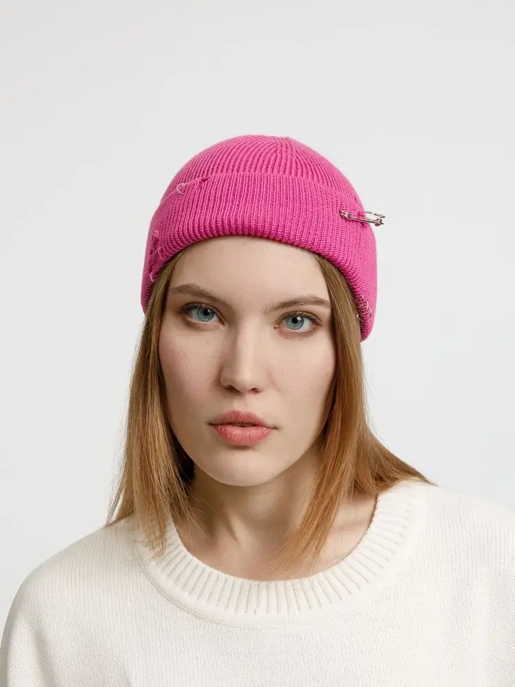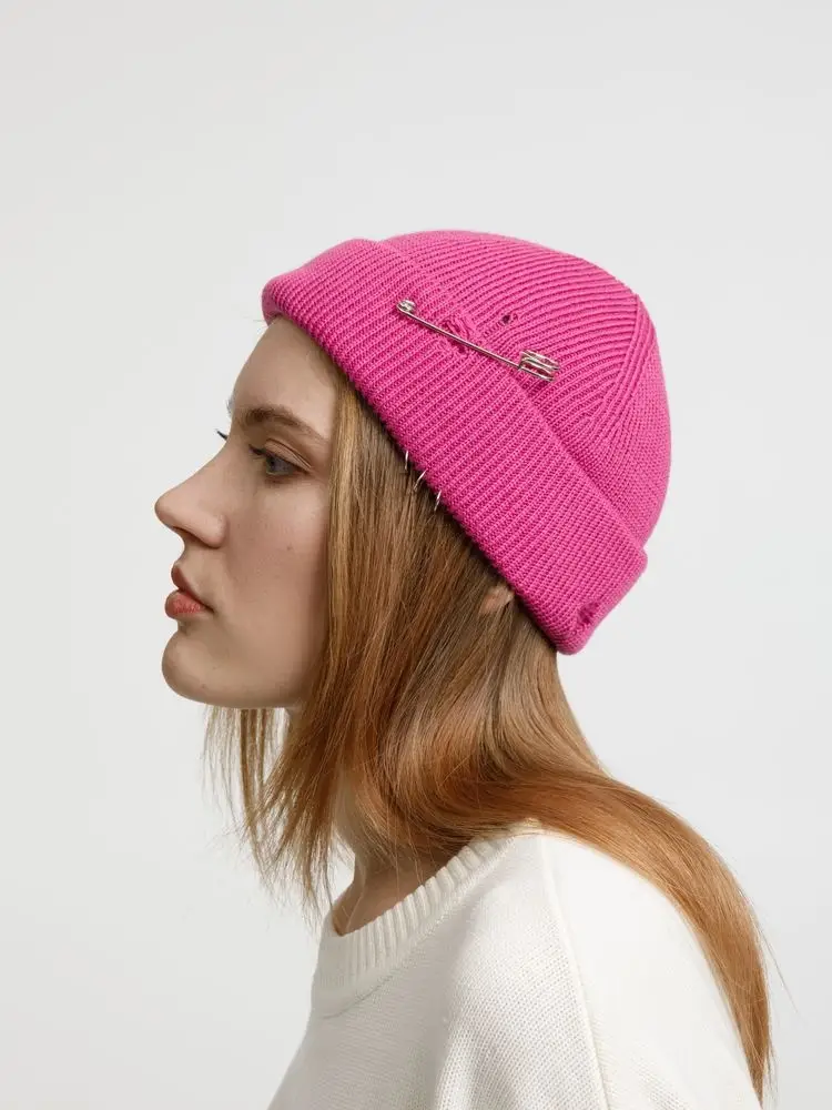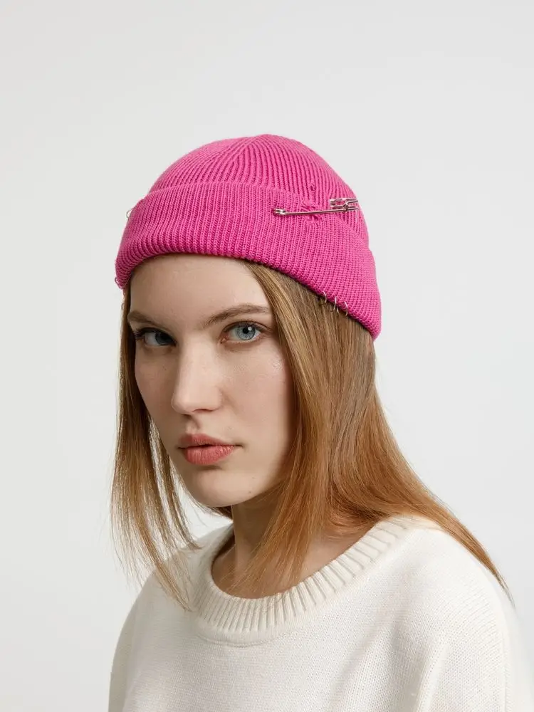 Однослойная шапка бини с рваным отворотом и металлическими аксессуарами для дерзких образов в любом возрасте. Яркий и запоминающийся акцент в стиле гранж.