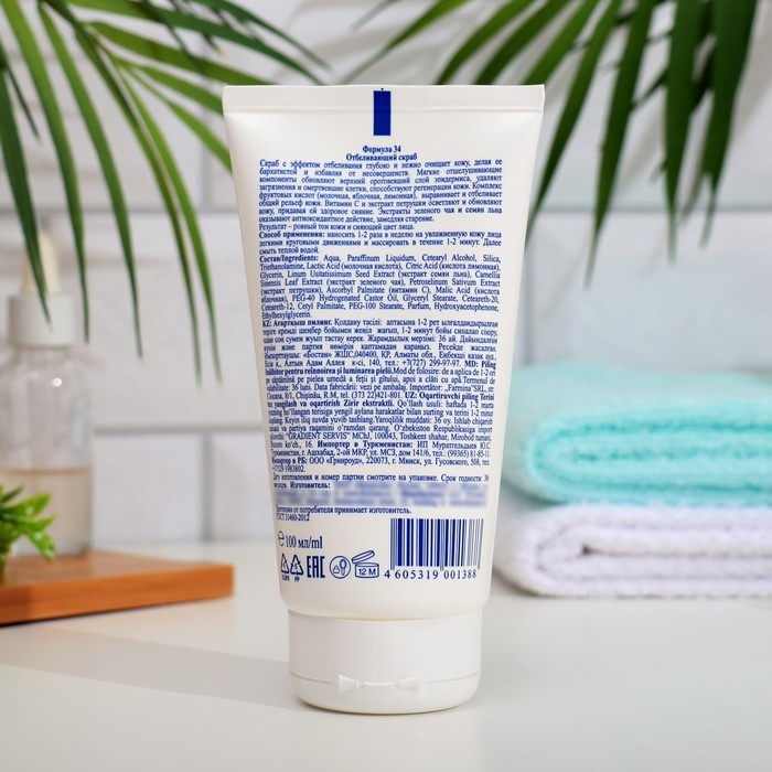 Пилинг является прекрасным средством для очищения, обновления и отбеливания кожи любого типа. Комплекс фруктовых кислот (молочная, яблочная, лимонная), мягко отшелушивают верхний слой эпидермиса, выравнивая и отбеливая общий рельеф кожи. Витамин С и экстракт петрушки осветляют и обновляют кожу, придавая ей здоровое сияние. Экстракты зеленого чая и семян льна оказывают антиоксидантное действие, замедляя старение.Результат – ровный тон кожи и сияющий цвет лица-осветляет пигментные пятна-выравнивает тон кожи-антиоксидантное действие.