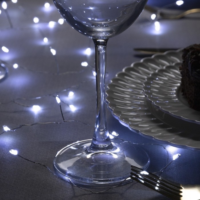 Гирлянда «Мишура» 2 м роса, IP20, серебристая нить, 50 LED, батарейки CR2032х2 (в комплекте), свечение белое
