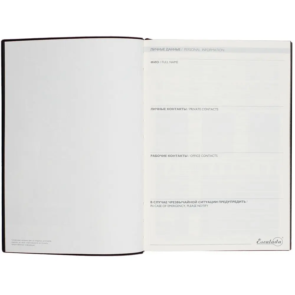 Ежедневник с гибкой обложкой и закладкой из искусственной кожи, дополнен капталом и двойным ляссе.
