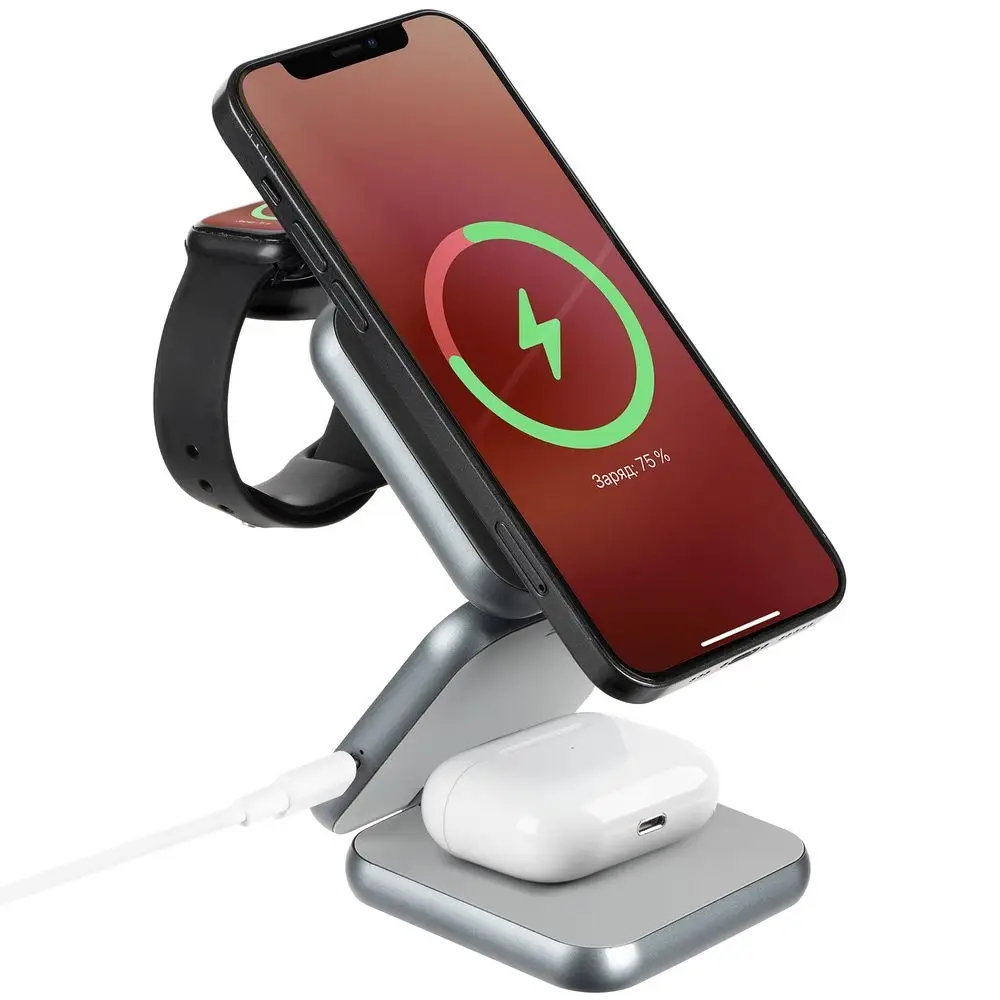 Зарядная станция совместима со всеми смартфонами, поддерживающими технологию беспроводной зарядки Qi. Также предусмотрено место для зарядки часов Apple Watch и наушников. Зарядка начнется автоматически при размещении устройств на индукционной площадке.