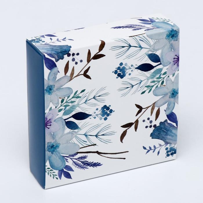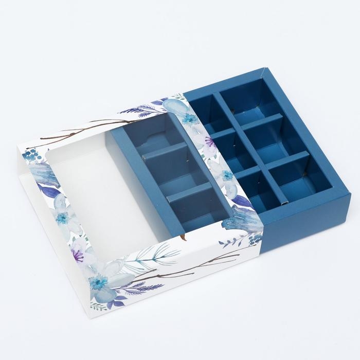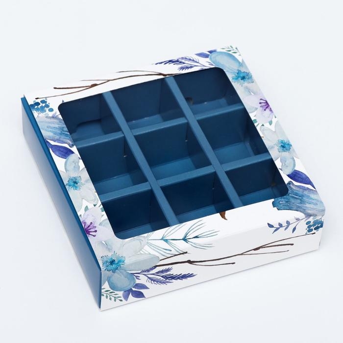 Коробка под 9 конфет с обечайкой " Голубые цветы " с окном 14,5 х 14,5 х 3,5 см