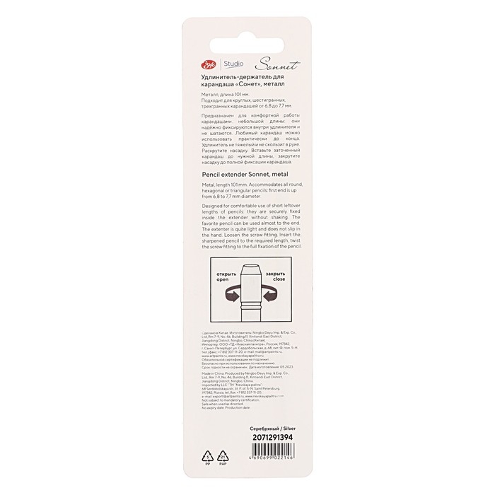 Удлинитель-держатель для карандаша — это незаменимый аксессуар для художников-графиков, предназначен для максимального удобства работы с короткими карандашами. Благодаря надежному зажиму может удерживать карандаши с диаметром корпуса от 7 до 7,8 мм. Выполненный из металла, инструмент практичен и прост в использовании.