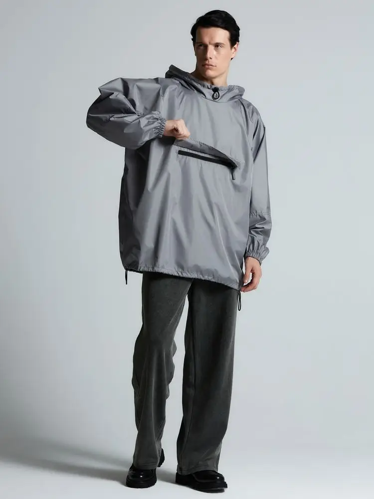 Дождевик-анорак с капюшоном и карманом на молнии спереди. Выполнен из ткани дюспо с матовой поверхностью — легкой, мягкой на ощупь, но устойчивой к повреждениям. Она не шелестит и практически не мнется. Благодаря пропитке дюспо обладает отличными водоотталкивающими и ветрозащитными свойствами.