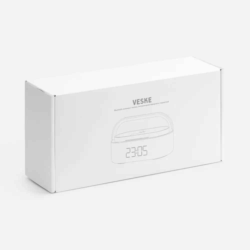 Veske — это Bluetooth-колонка с электронными часами, площадкой для беспроводной зарядки смартфона и подсветкой.
