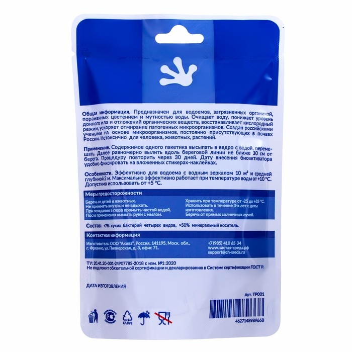 Одним из таких средств является биоактиватор ""Пруд"", производимый под торговой маркой ""Чистая среда"". Дой-пакет содержит 60 граммов данного продукта, который способен эффективно очистить воду от различных загрязнений.