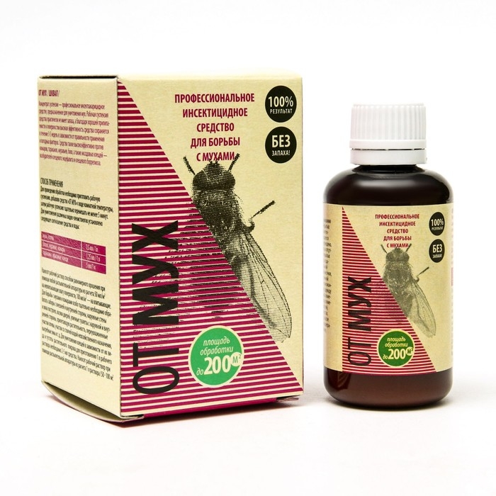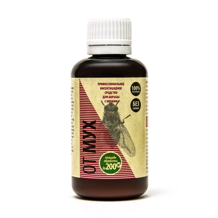 Профессиональное инсектицидное средство в форме концентрата, адаптированное для бытового применения. Предназначено для уничтожения мух. Представляет из себя белую жидкость, которую перед применением необходимо развести водой согласно инструкции. Средство обладает острой инсектоакарицидной активностью в течение 24-48 часов и – благодаря форме суспензии – более длительной эффективностью в течение 4-6 недель. Не оставляет следов, не имеет запаха.Действующее вещество: альфа-циперметрин 10%Способ применения:Концентрат нужно развести в воде комнатной температуры (от мух 2,5 мл средства на 1 л воды) и тщательно перемешать в течение 5 минут.Наносят готовый раствор с помощью распылительной аппаратуры из расчета 50 мл на кв. м на невпитывающие влагу поверхности и 100 мл на кв. м - на впитывающие. Это инсектицид контактно-кишечного действия, т.е. насекомое погибает после контакта с обработанной поверхностью, для избавления от мух на участке рекомендуется обрабатывать весь участок, места скопления насекомых и выплода личинок (заборы с внешней и внутренней стороны, стены и окна построек, косяки дверей, уличные туалеты, прилегающую растительность, участки с повышенной влажностью, выгребные ямы)