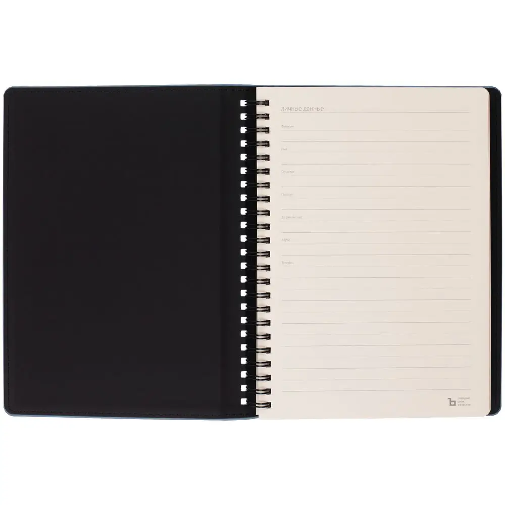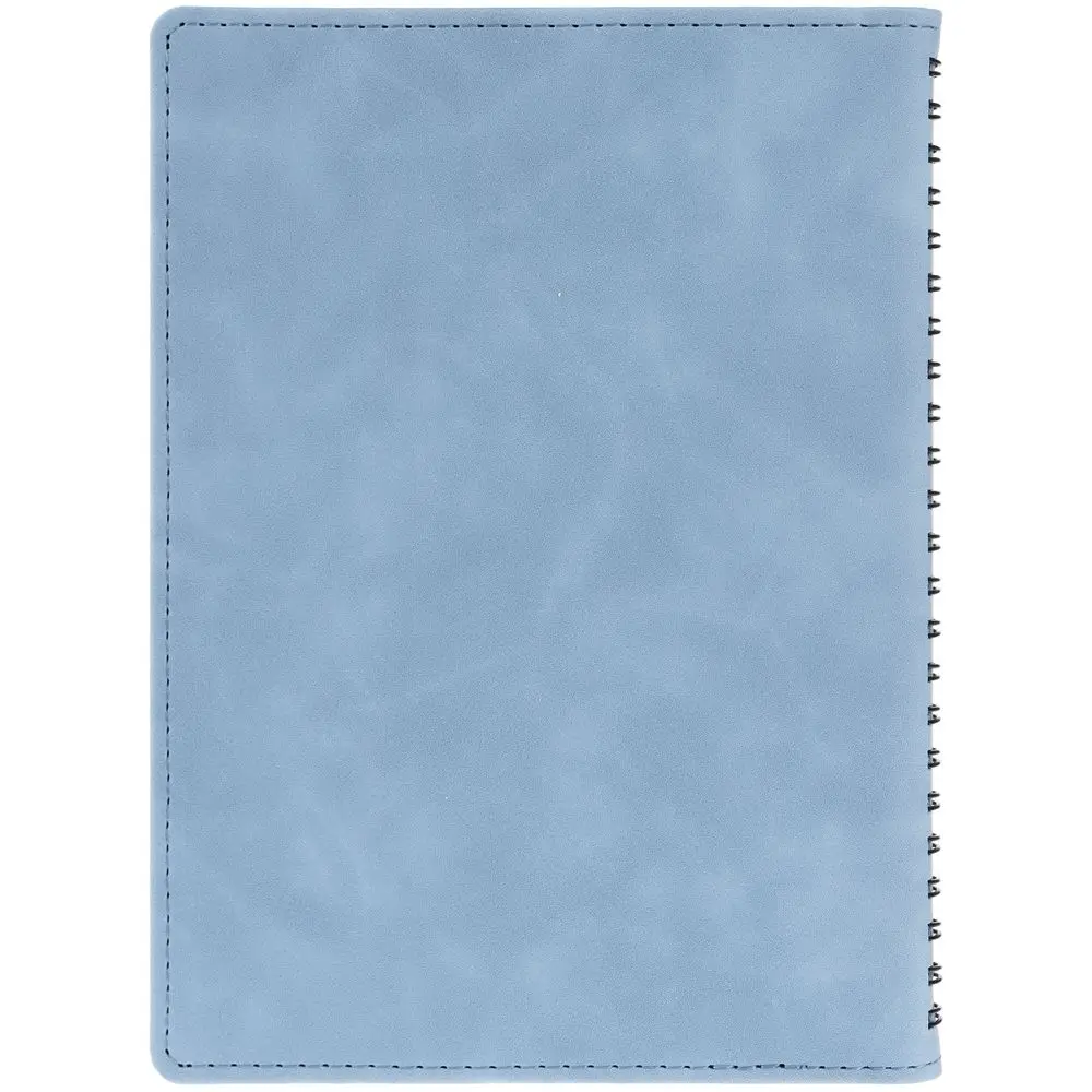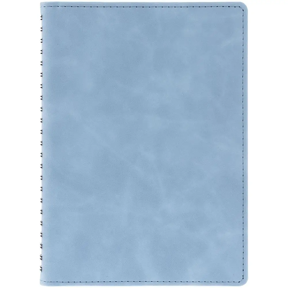 Ежедневник с блоком на пружине в твердой обложке, выполнен из материалов Nubuk Touch, голубой JJ и Soft Touch, черный AA.