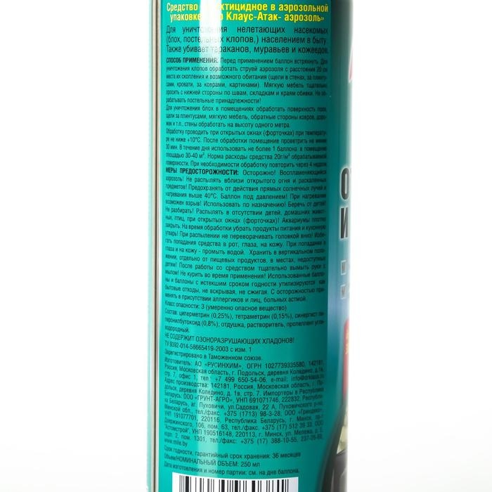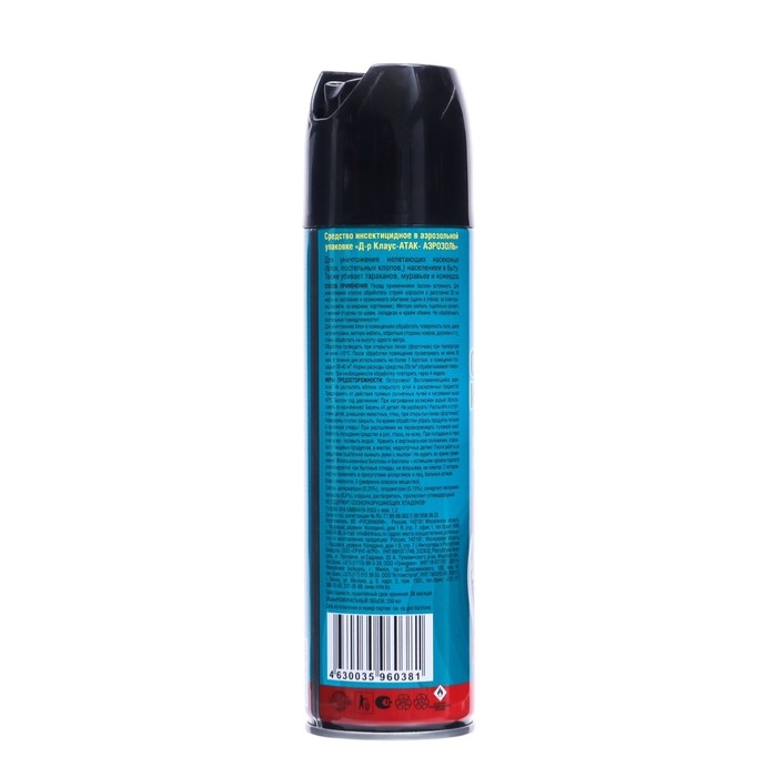 ОписаниеDr.Klaus Аэрозоль от клопов, блох и других насекомых, баллон 250 мл. Аэрозоль Dr.Klaus предназначен для уничтожения нелетающих насекомых (блох, постельных клопов) населением в быту. Также убивает тараканов, муравьев и кожеедов.Способ применения: перед применением баллон встряхнуть. Для уничтожения клопов обработать струей аэрозоля с расстояния 20 см места их скопления и возможного обитания (щели в стенах, за плинтусами, кровати, за коврами, картинами). Мягкую мебель тщательно оросить с нижней стороны по швам, складкам и краям обивки. Не обрабатывать постельные принадлежности. Для уничтожения блох в помещениях обработать поверхность пола, щели за плинтусами, мягкую мебель, обратные стороны ковров, дорожек и т.п., стены обработать на высоту одного метра. Обработку проводить при открытых окнах (форточках) при температуре не ниже +10°С. После обработки помещение проветрить не менее 30 мин. В течение дня использовать не более 1 баллона в помещение площадью 30-40 м². Норма расходы средства 20г/м² обрабатываемой поверхности. При необходимости обработку повторить через 4 недели.Меры предосторожности: воспламеняющийся аэрозоль. Не распылять вблизи открытого огня и раскаленных предметов. Предохранять от действия прямых солнечных лучей и нагревания выше 40°С. Баллон под давлением. При нагревании возможен взрыв. Использовать по назначению. Беречь от детей. Не разбирать. Распылять в отсутствии детей, домашних животных, птиц, при открытых окнах (форточках). Аквариумы плотно закрыть. На время обработки убрать продукты питания и кухонную утварь. При распылении не переворачивать головкой вниз. Избегать попадания средства в рот, глаза, на кожу. При попадании в глаза и на кожу - промыть водой. Хранить в вертикальном положении, отдельно от пищевых продуктов, в местах, недоступных детям! После работы со средством тщательно вымыть руки с мылом. Не курить во время применения. Использованные баллоны и баллоны с истекшим сроком годности утилизируются как бытовые отходы, не вскрывая, не сжигая. С осторожностью применять в присутствии аллергиков и лиц, больных астмой.Составциперметрин (0,25%), тетраметрин (0,15%), синергист пиперонилбутоксид (0,8%), отдушка, растворитель, пропеллент углеводородный.