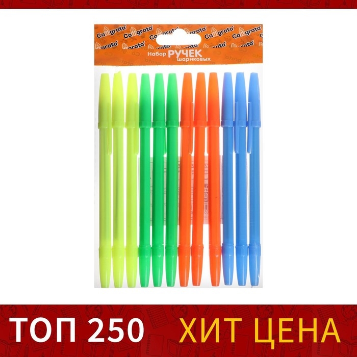 Набор ручек, шариковых 12 штук, стержень 0.7 мм, синий, корпус НЕОН