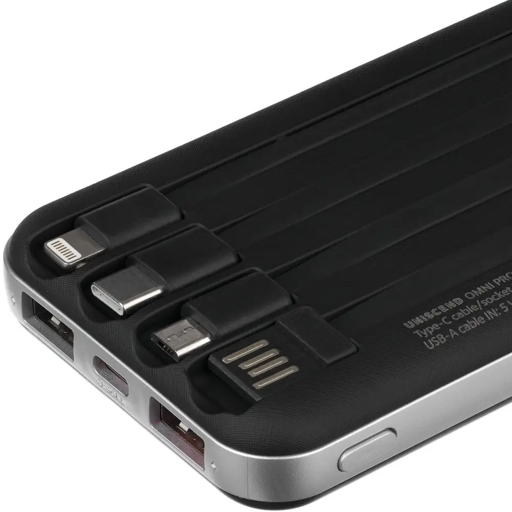 Обновленная модель популярной линейки Omni от бренда Uniscend теперь с поддержкой Power Delivery и возможностью быстрой зарядки смартфона или ноутбука через встроенный кабель Type-C и разъемы USB-A и Type-C (с подходящим для быстрой зарядки проводом). Полный комплект встроенных проводов и цифровой индикатор заряда остались на месте.