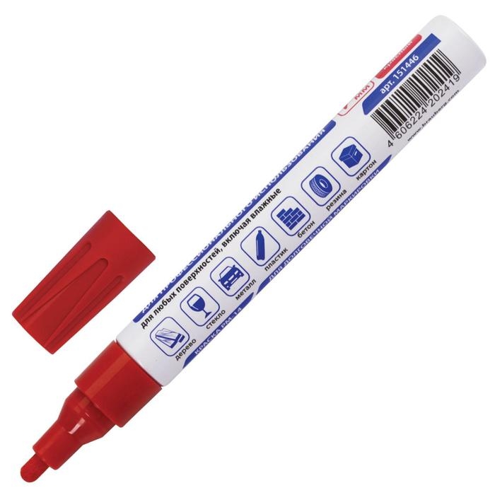 Маркер-краска лаковый BRAUBERG предназначен для маркировки различных материалов в промышленных условиях: бетона, дерева, стекла, металла, резины, пластика. Заправлен краской с усиленной формулой на нитро-основе РМ-14. СПОСОБ ПРИМЕНЕНИЯ:1. Перед использованием хорошо встряхнуть с закрытым колпачком.2. Снять колпачок, надавить на наконечник, дождаться, когда краска полностью пропитает его.3. После использования плотно закрыть колпачок.Чернила с лаковым эффектом производства компании MULTICHEM являются экологичными и безопасными для окружающей среды. Благодаря усиленной формуле идеально подходят для нанесения долговечной маркировки на любых поверхностях, включая влажные. Отличаются термо- и водостойкостью, устойчивы к выцветанию. Пишет по сухим, жирным, грязным, ржавым и влажным поверхностям. Ширина линии письма составляет 2-4 мм. Прочный круглый наконечник выполнен из пористого акрила. Алюминиевый корпус.