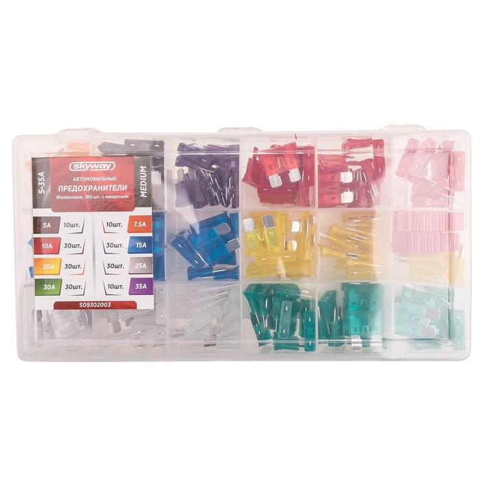 Предохранитель флажковый MEDIUM набор 180шт 5-35А в пластиковой коробке SKYWAY- набор пластмассовых предохранителей, предназначены для защиты бортовой электрической цепи автомобиля от перегрева и коротких замыканий. Изготовлены из термостойкой пластмассы с вставками из цинка. Важнейшая деталь для Вашего автомобиля.