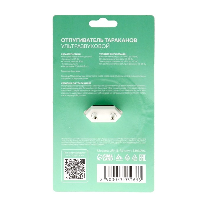 Отпугиватель тараканов LuazON LRI-18 экологически безвреден и безопасен для людей и домашних животных. Площадь воздействия: до 30 квадратных метров. Работает от сети 220 – 240 В (~).