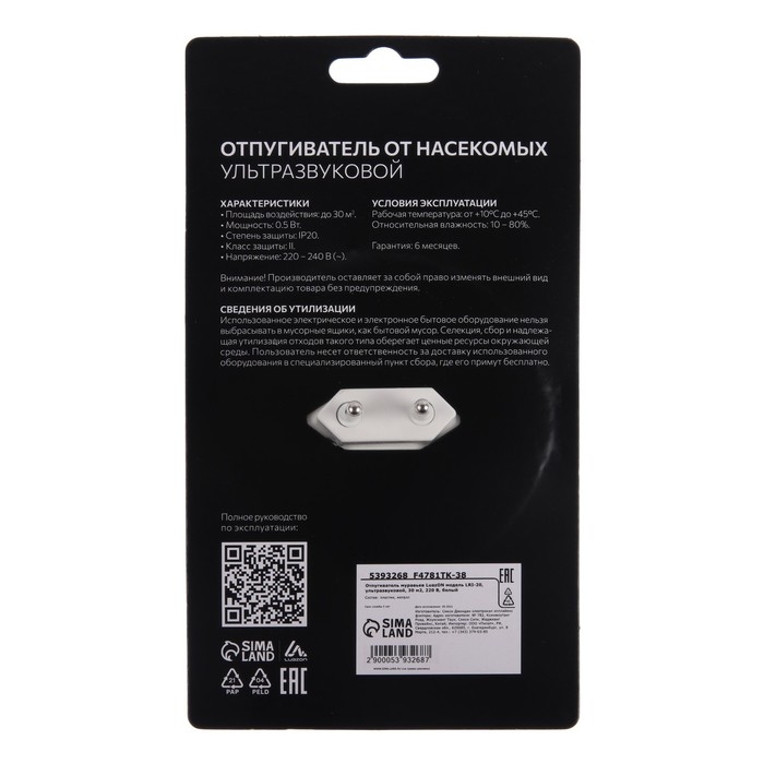 Отпугиватель крыс и насекомых Luazon LRI-11, ультразвуковой, 70 м2, 220 В, белый