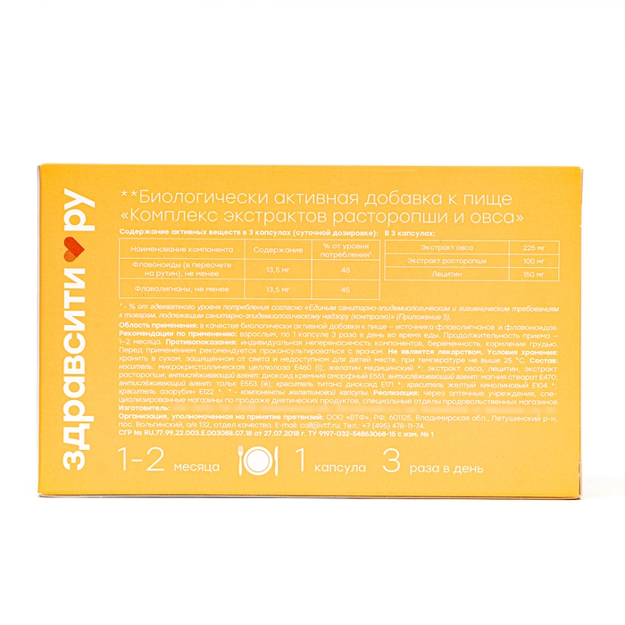 Состав: носитель: микрокристаллическая целлюлоза Е460(i); желатин медицинский, экстракт овса, лецитин, экстракт расторопши; антислёживающий агент: диоксид кремния аморфный Е551; антислёживающий агент: магния стеарат Е470; антислёживающий агент: тальк Е553(iii), краситель: титана диоксид Е171; краситель: желтый хинолиновый Е104; краситель: азорубин Е122, компоненты желатиновой капсулы.