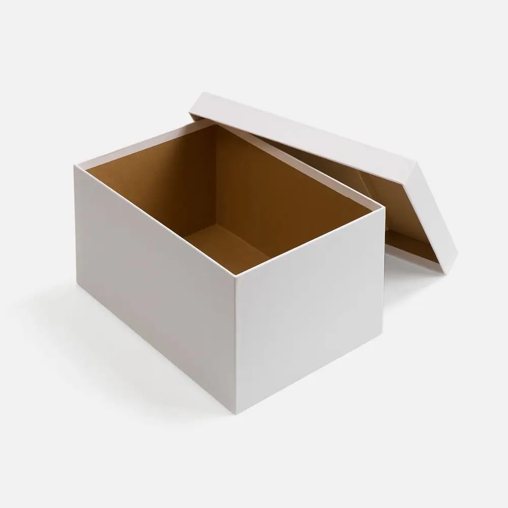 Коробка из переплетного картона, кашированного белой дизайнерской бумагой.