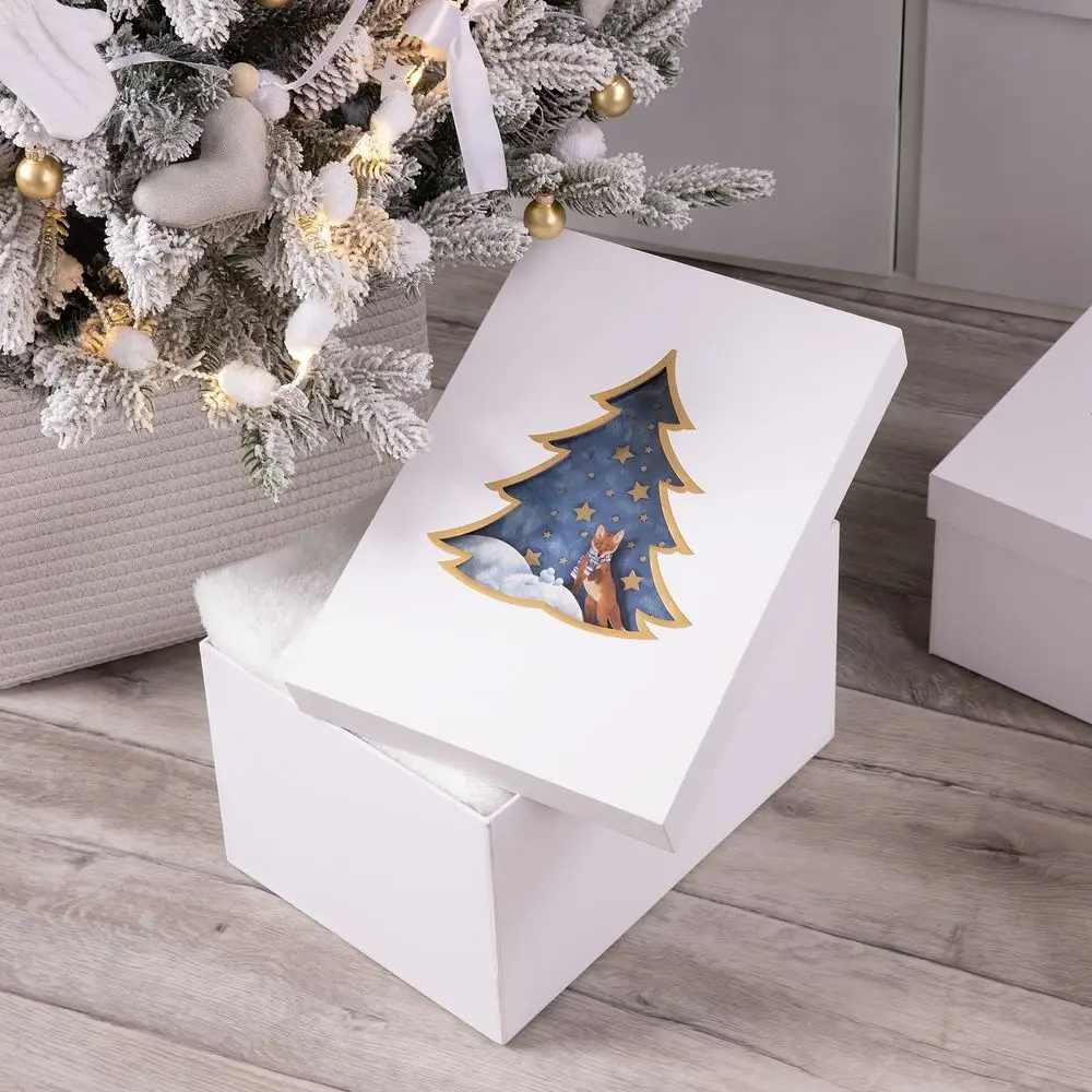 Белоснежная коробка из переплетного картона с окошком в форме ели, которое приглашают в мир зимних чудес. Внутри ждет очаровательная лисичка в пушистом снегу. 3D-иллюстрация наполняет пространство теплом и радостным предвкушением чуда, а подвижные шарики из пенопласта вызывают по-настоящему детский восторг.