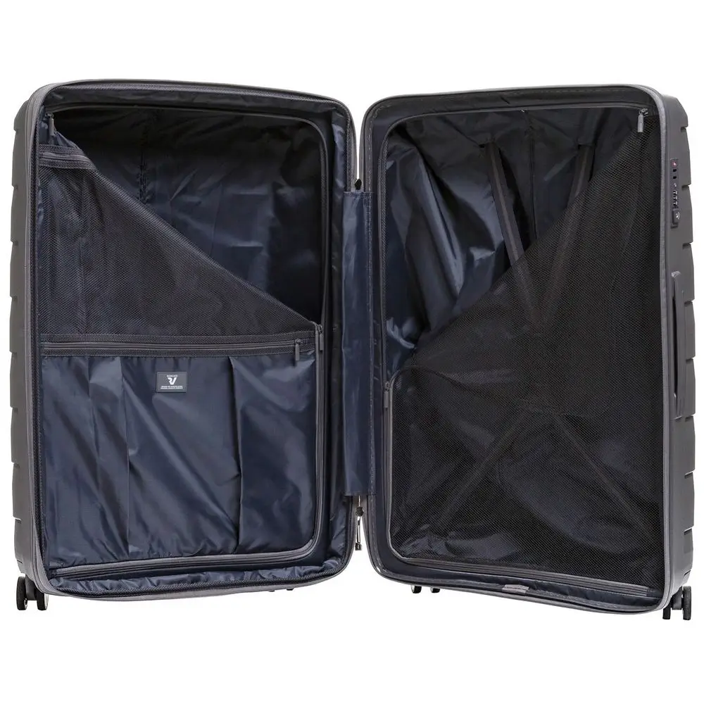 - Чемодан с 2 отделениями: одно из них с фиксирующими ремнями и сетчатой шторкой на молнии, второе — с разделителем на молнии