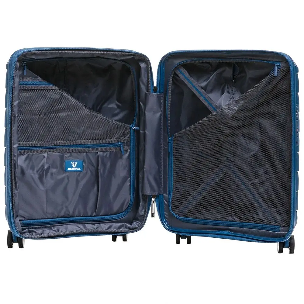 - Чемодан с 2 отделениями: одно из них с фиксирующими ремнями и сетчатой шторкой на молнии, второе — с разделителем на молнии