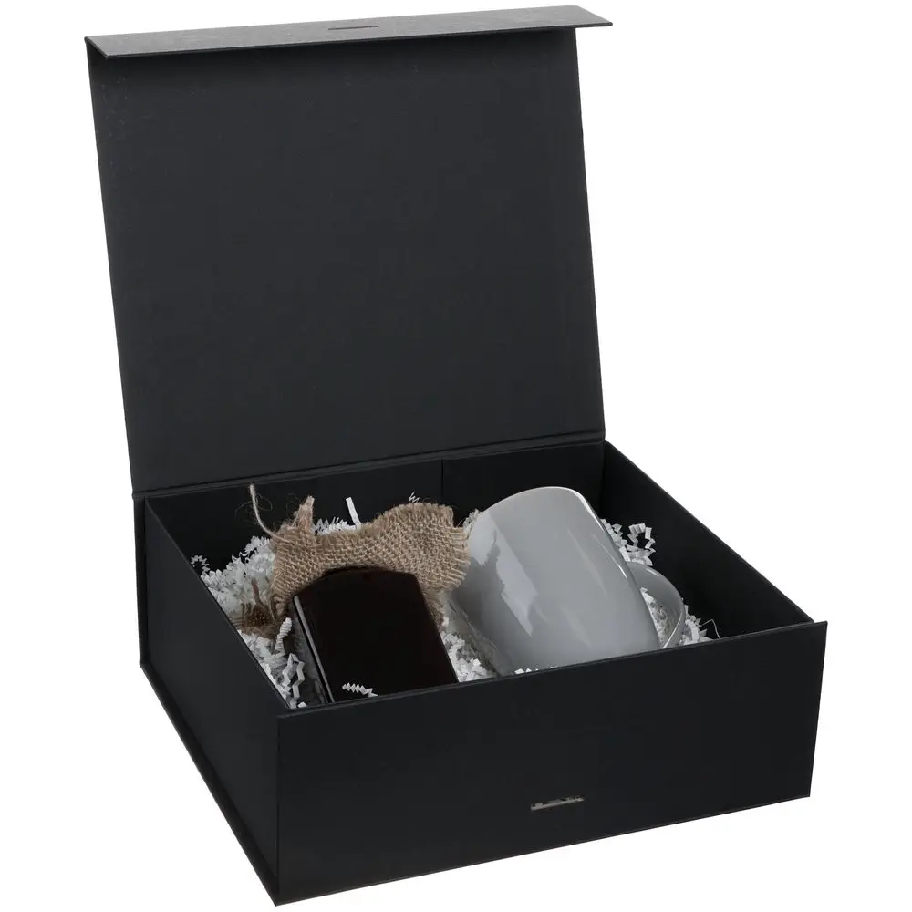 Коробка из переплетного картона, кашированного тонированной в массе крафтовой бумагой. Крышка на двух магнитах дополнительно фиксируется репсовой лентой.Толщина картона 2 мм.