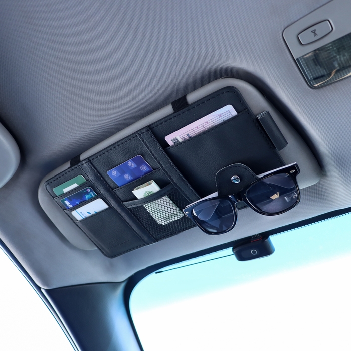 Органайзер на козырёк автомобиля поможет поддержать порядок в машине и при этом всегда иметь все необходимое под рукой! Панель органайзера оснащена кармашками для банковских, визитных карточек и других ценных предметов небольшого размера, так же имеется держатель для ручки и очков. Прикрепляется органайзер на солнцезащитный козырек двумя резинками.