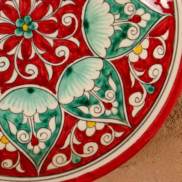 Тарелка Риштанская Керамика "Цветы", красная, плоская, 15 см, микс